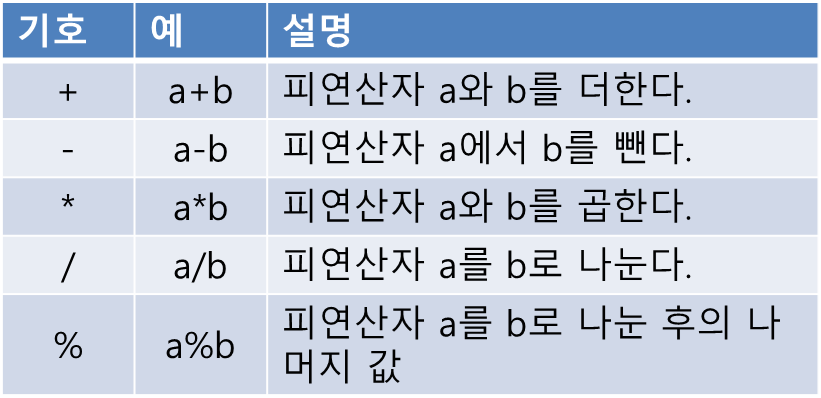 수식 연산자의 종류는 아래와 같습니다.