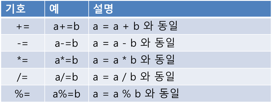 기본적으로 왼쪽 피연산자와 오른쪽 피연산자를 연산한 결과값을 다시 왼쪽 피연산자에 지정해주는 연산자입니다.